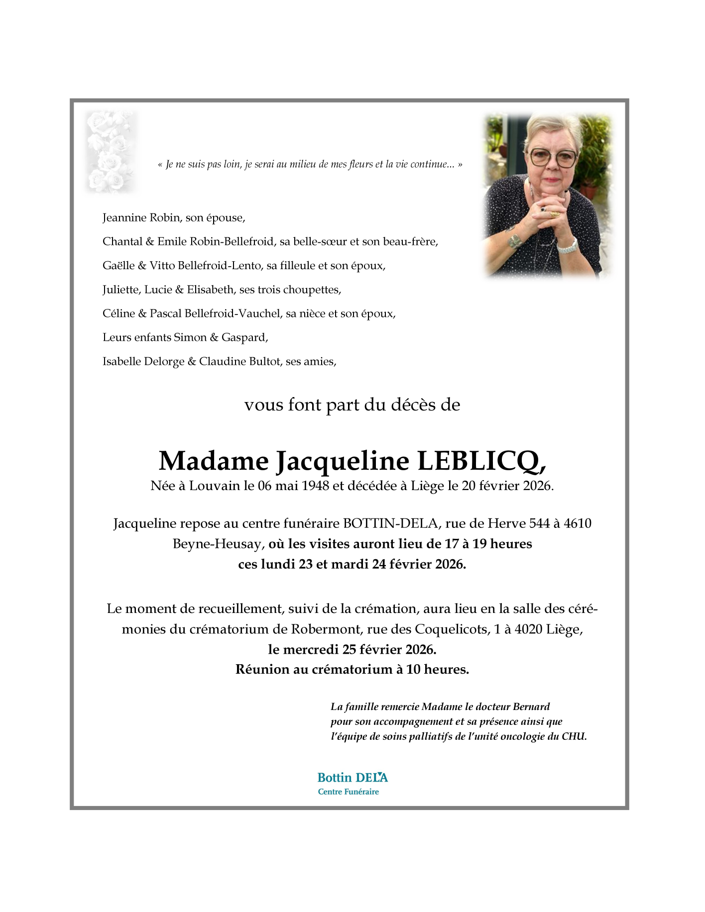 Fallecida en Liège (4000) el viernes, 20 de febrero de 2026 a la edad de 77 años