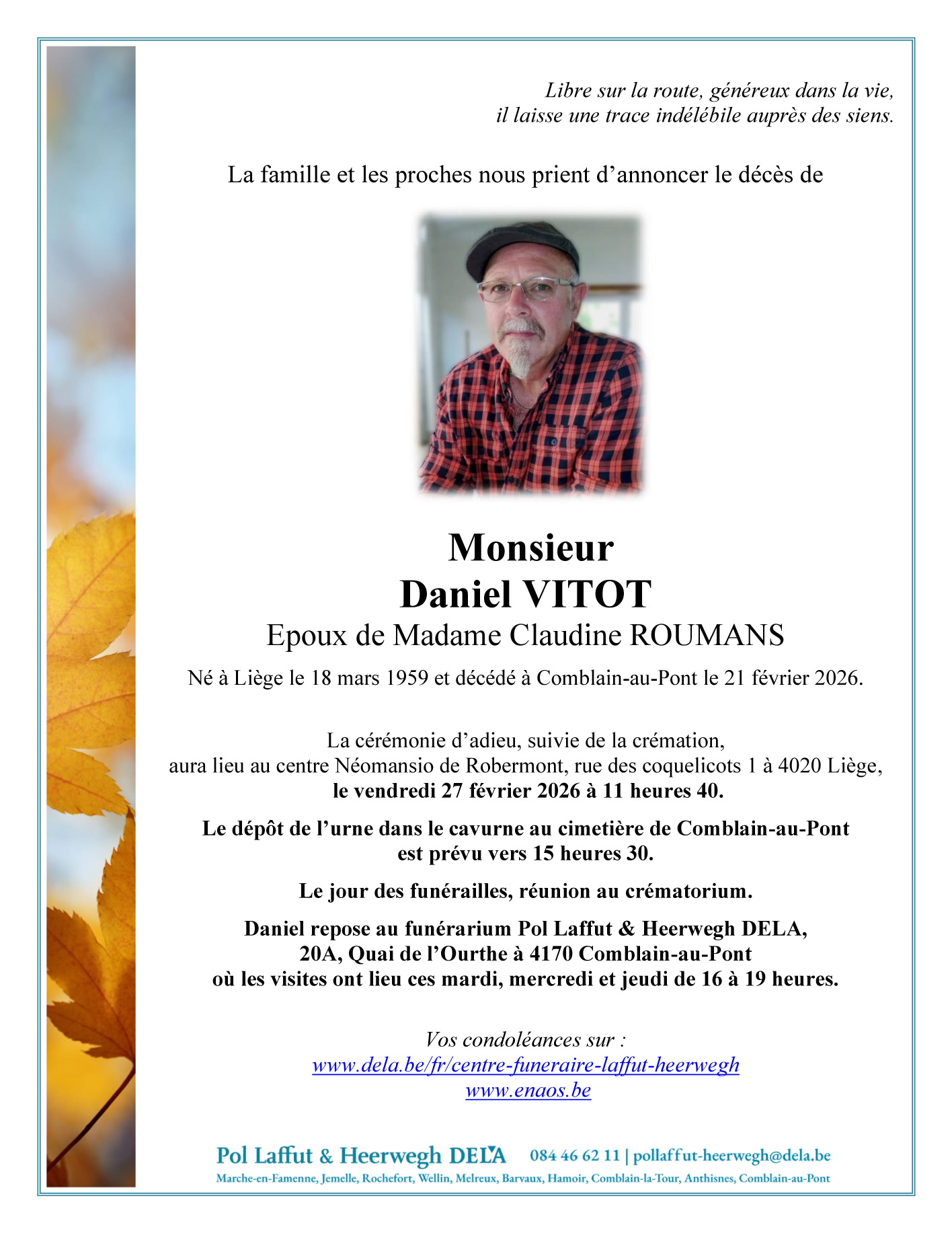 Décédé à Comblain-au-Pont (4170) le samedi 21 février 2026 à l'âge de 66 ans