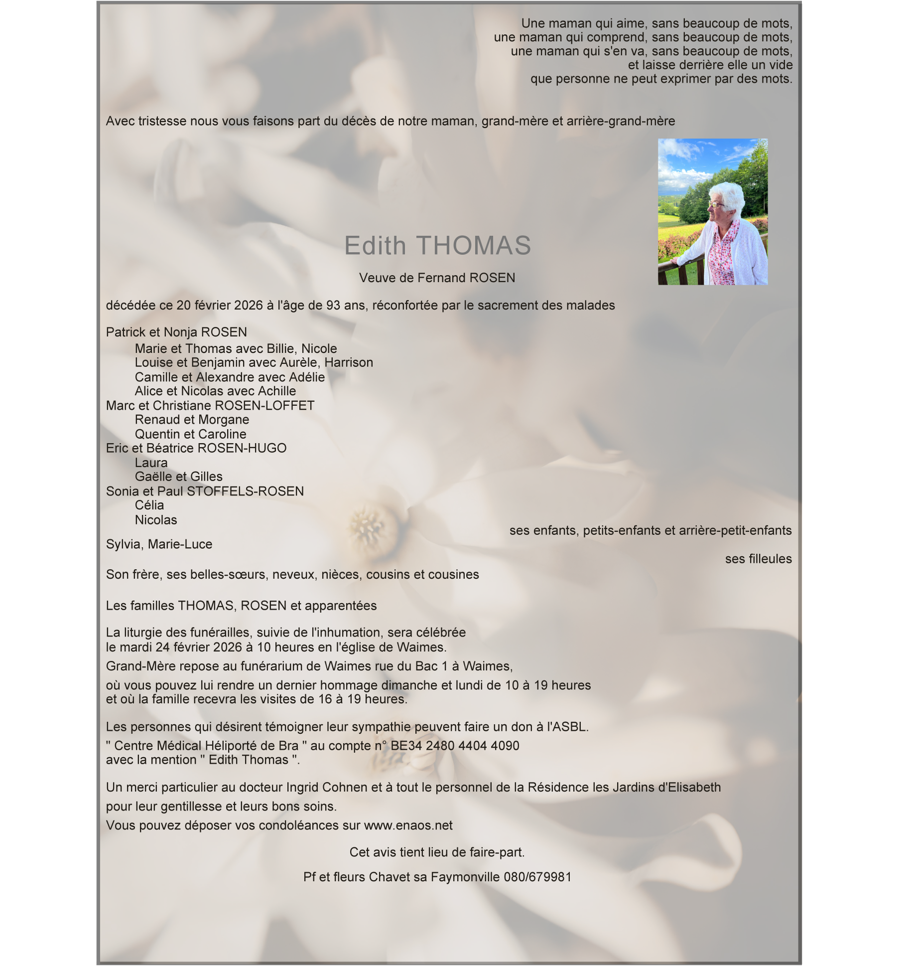 Décédée à Waimes (4950) le vendredi 20 février 2026 à l'âge de 93 ans