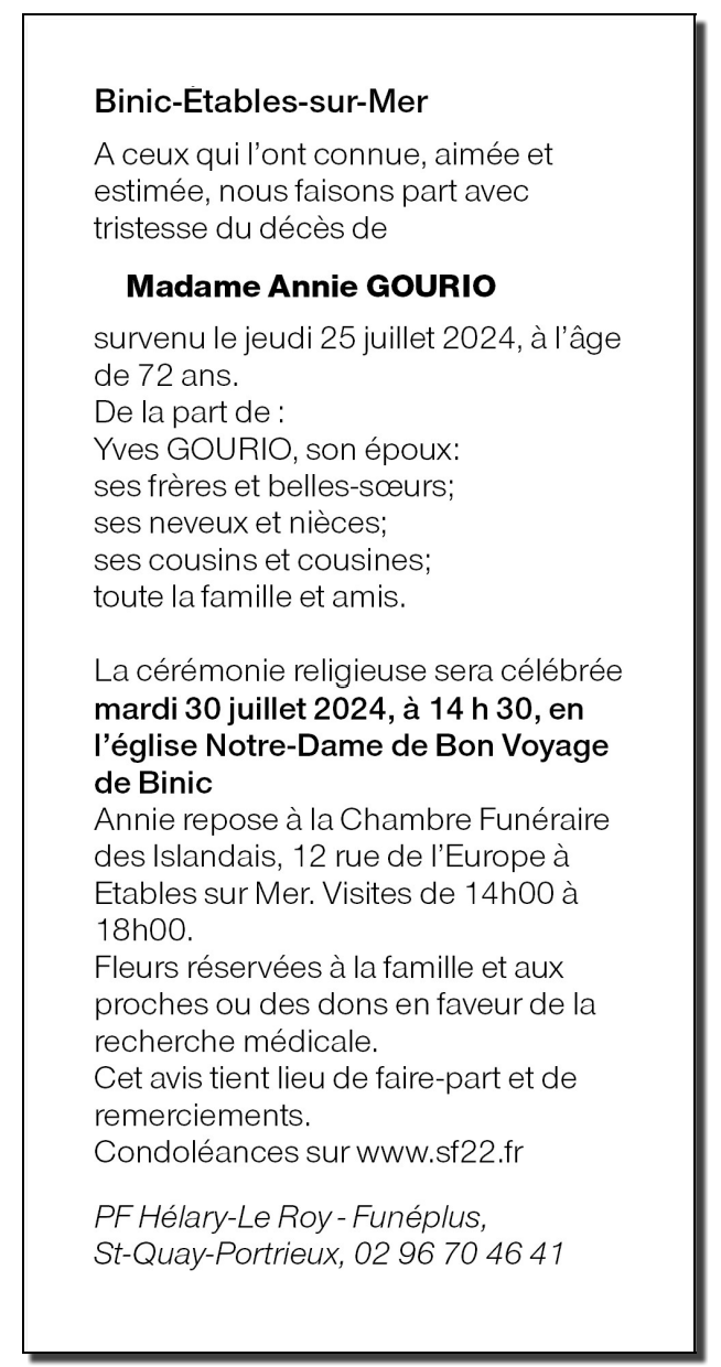 Décédée à Ereac (22250, France) le jeudi 25 juillet 2024 à l'âge de 72 ans