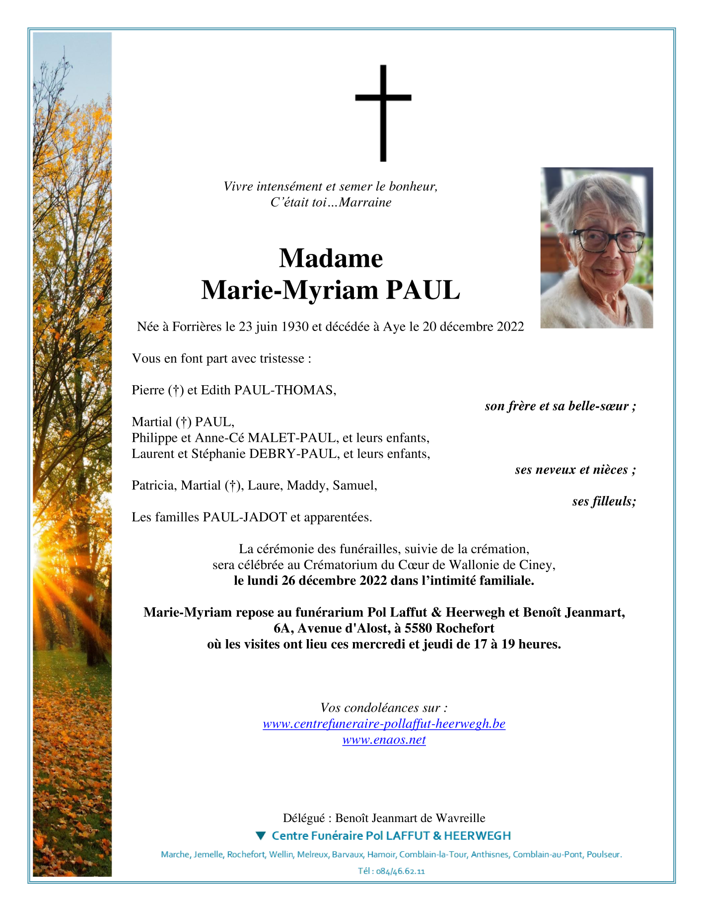Fallecida en Aye (6900) el martes, 20 de diciembre de 2022 a la edad de 92 años