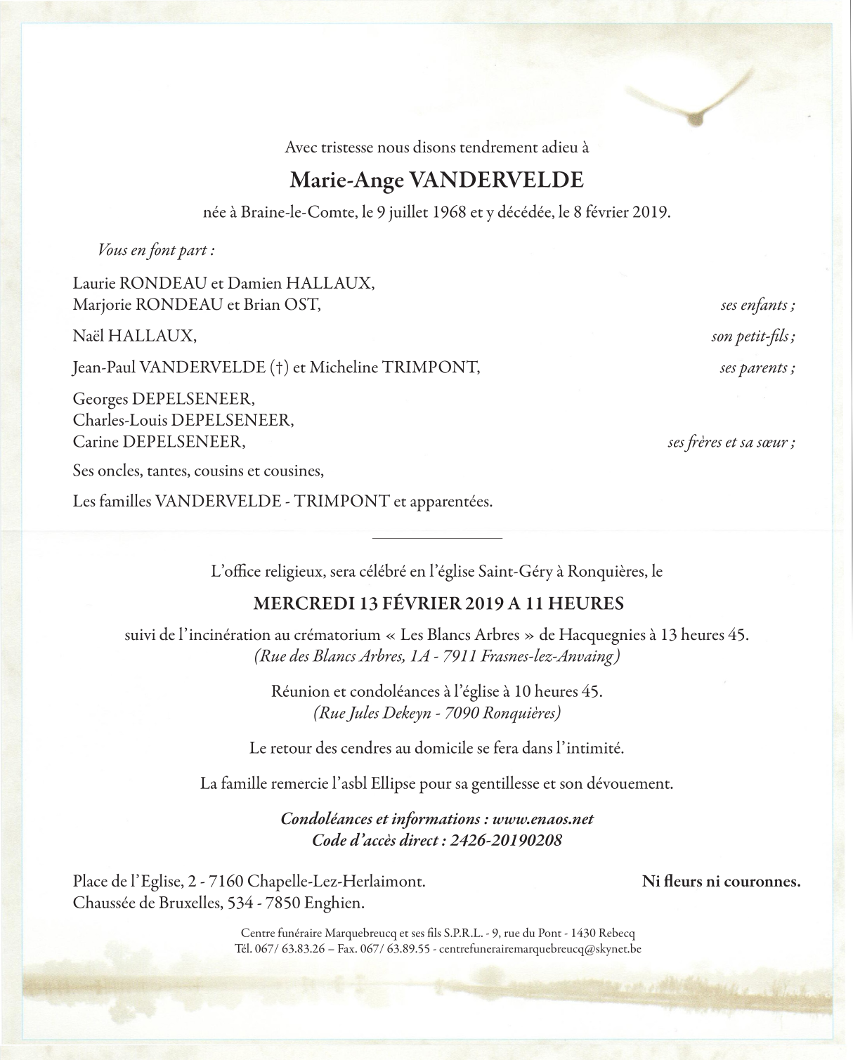 Décédée à Braine-le-Comte (7090) le vendredi 8 février 2019 à l'âge de 50 ans