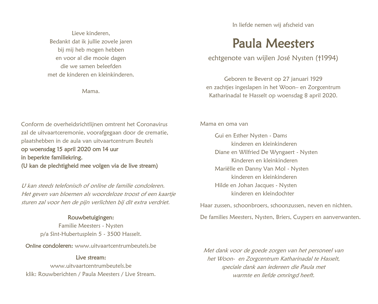 Décédée à Hasselt (3500) le mercredi 8 avril 2020 à l'âge de 91 ans