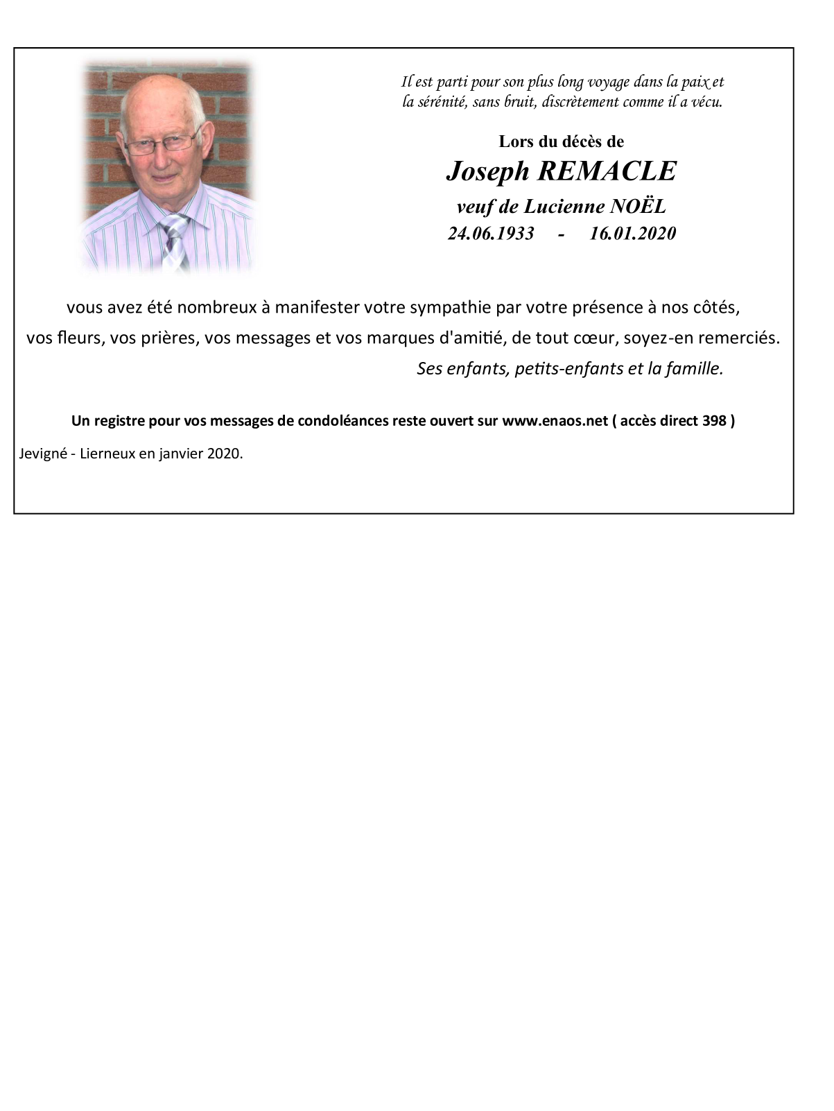 Décédé à Petit-Han (6940) le jeudi 16 janvier 2020 à l'âge de 86 ans