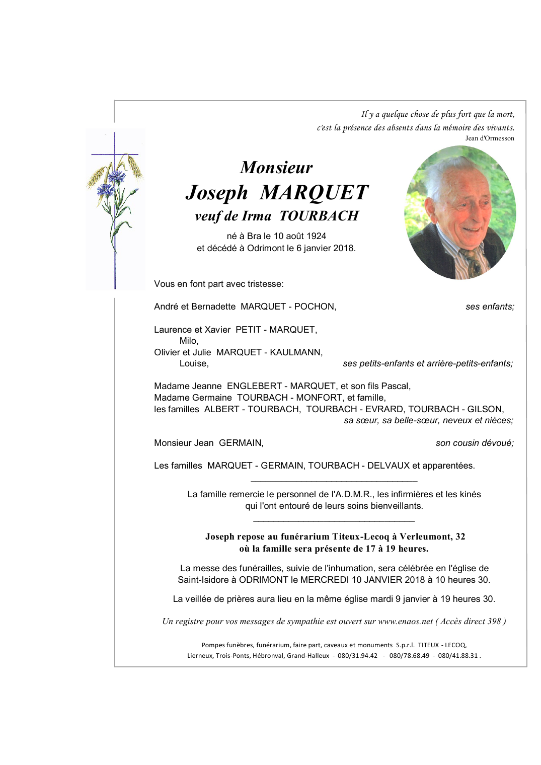 Fallecido en Odrimont (4990) el sábado, 6 de enero de 2018 a la edad de 93 años