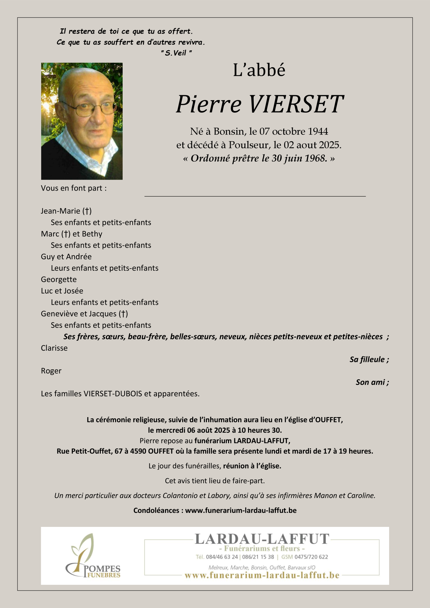 Décédé à Poulseur (4171) le samedi 2 août 2025 à l'âge de 80 ans