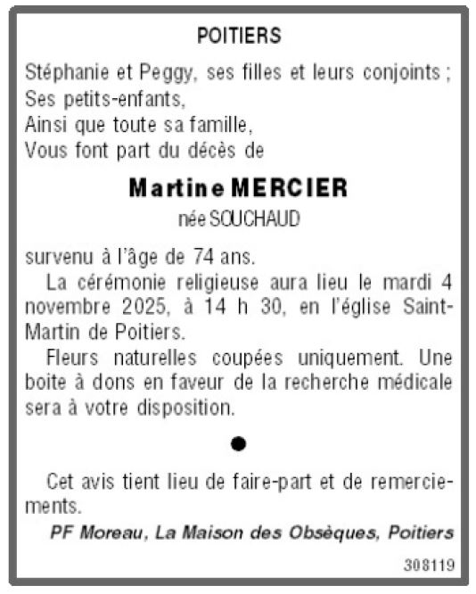 Décédée à Poitiers (86000, France) le mercredi 29 octobre 2025 à l'âge de 74 ans