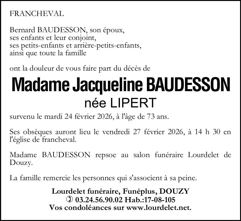 | Madame Jacqueline BAUDESSON geboren LIPERTWoonachtig te Francheval (08140, Frankrijk) Geboren te Euilly-et-Lombut (08210, Frankrijk) op maandag 20 oktober 1952 Overleden te Sedan (08200, Frankrijk) op dinsdag 24 februari 2026 op 73-jarige leeftijd Echtgenote van Monsieur Bernard BAUDESSON
