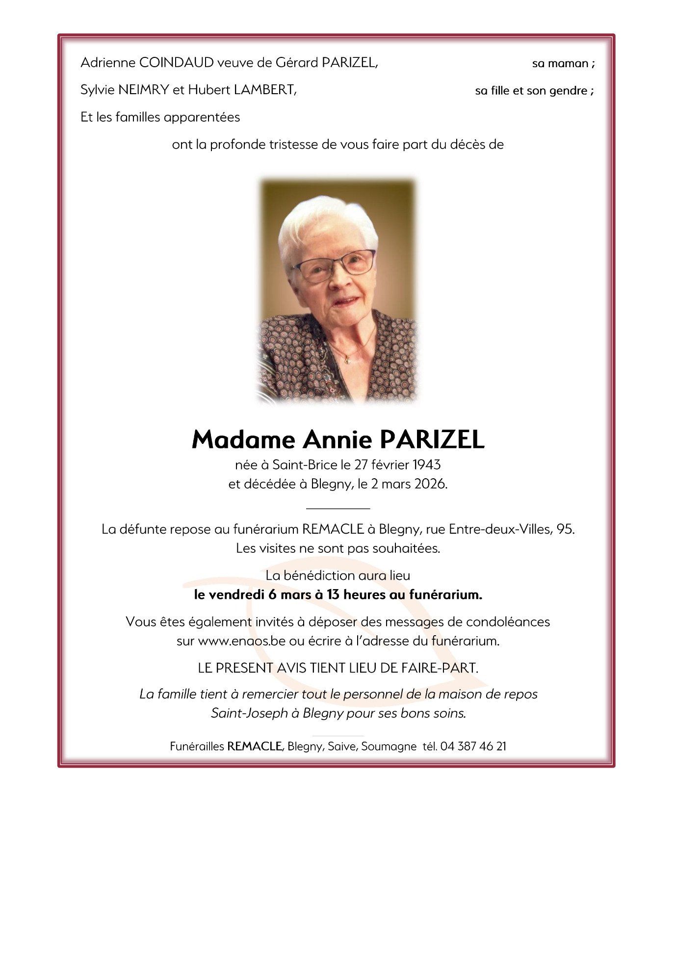 Décédée à Blegny (4670) le lundi 2 mars 2026 à l'âge de 83 ans