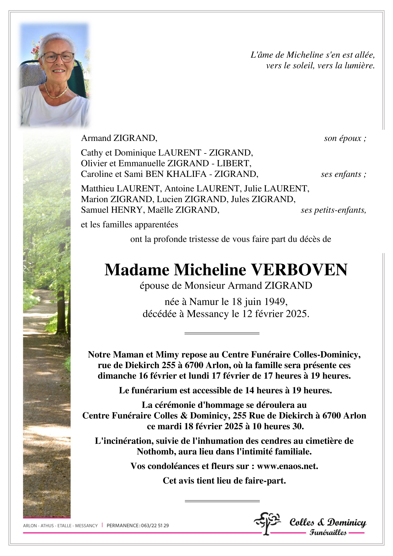 Décédée à Messancy (6780) le mercredi 12 février 2025 à l'âge de 75 ans