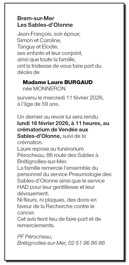 Décédée à Les Sables d'Olonne (85100, France) le mercredi 11 février 2026 à l'âge de 59 ans