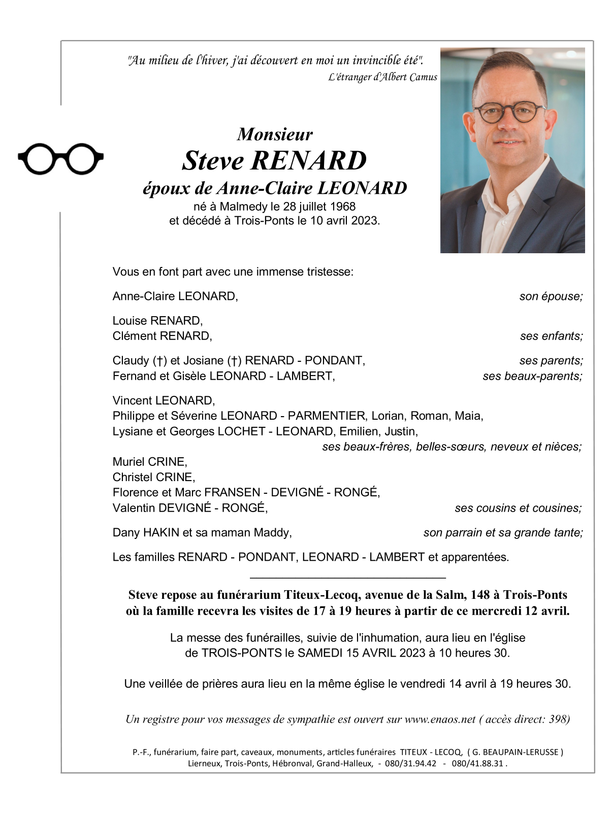 Fallecido en Trois-Ponts (4980) el lunes, 10 de abril de 2023 a la edad de 54 años
