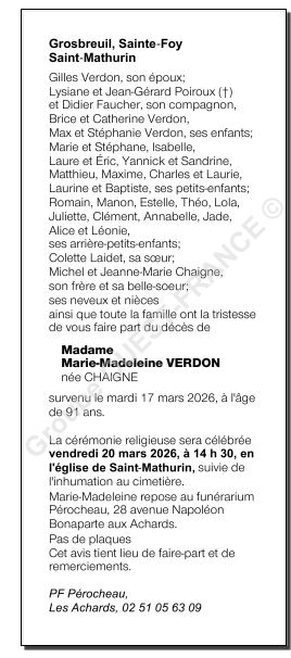 Madame Marie-Madeleine VERDON née CHAIGNE