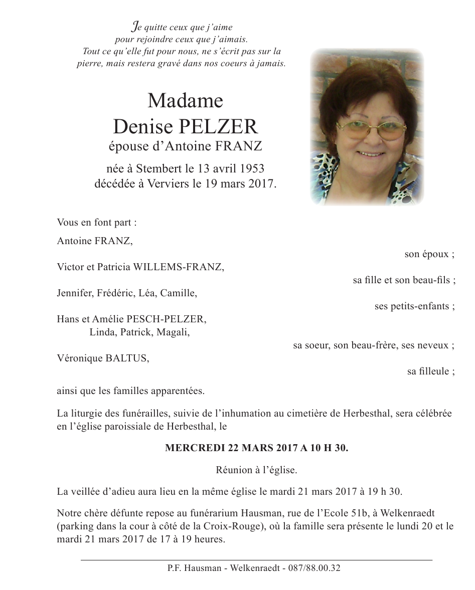 Overleden te Verviers (4800) op zondag 19 maart 2017 op 63-jarige leeftijd