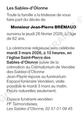 Décédé à Talmont-Saint-Hilaire (85440, France) le jeudi 26 février 2026 à l'âge de 82 ans