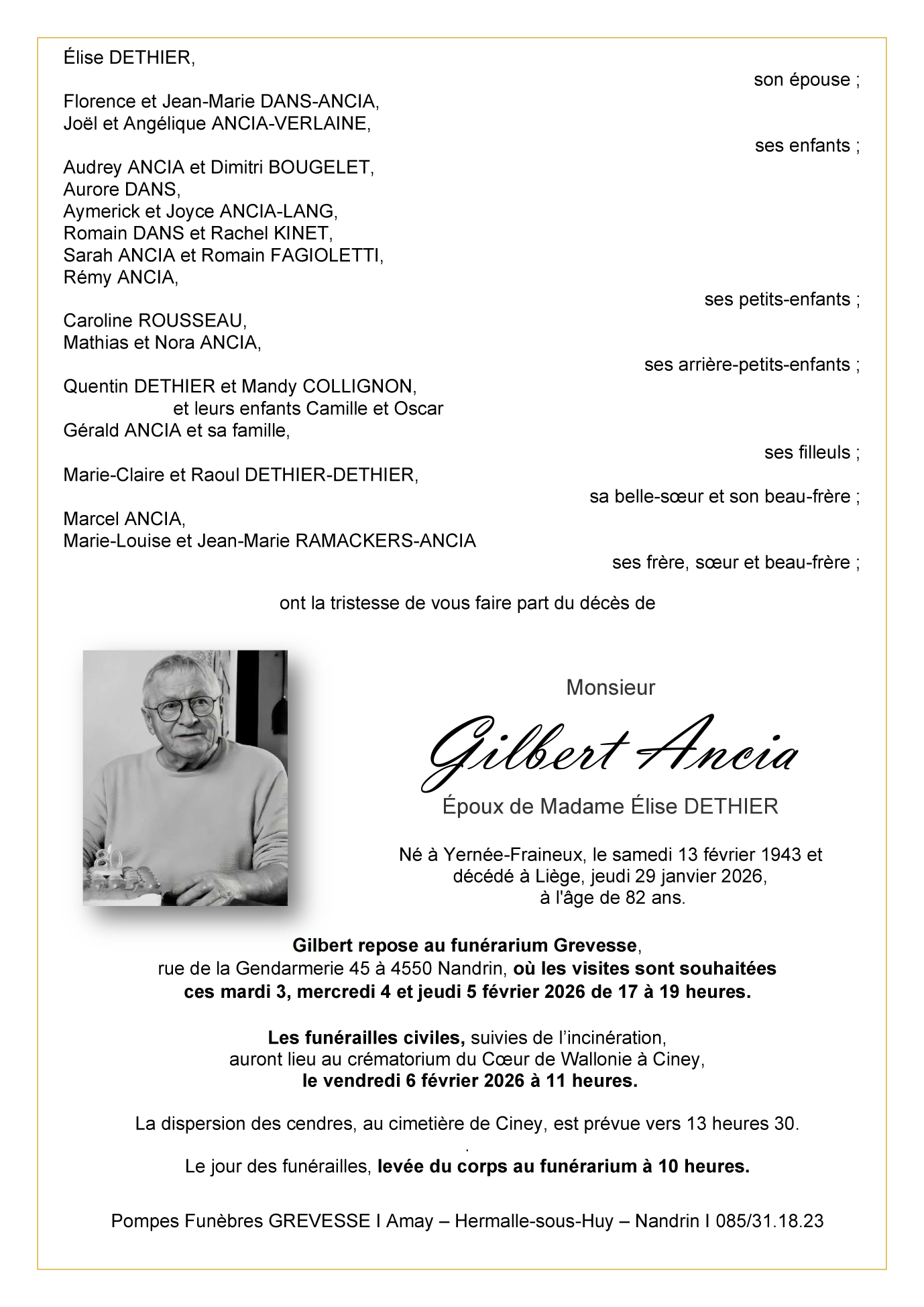 Né à Yernée-Fraineux (4550) le samedi 13 février 1943