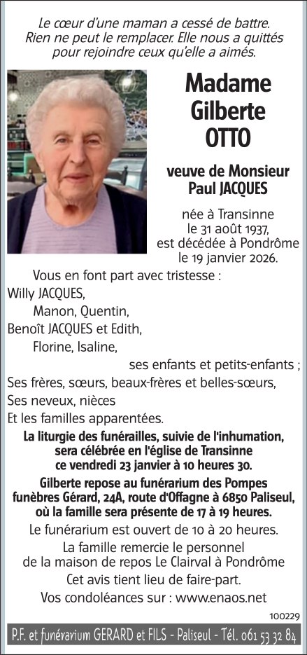 Décédée à Pondrôme (5574) le mardi 20 janvier 2026 à l'âge de 88 ans
