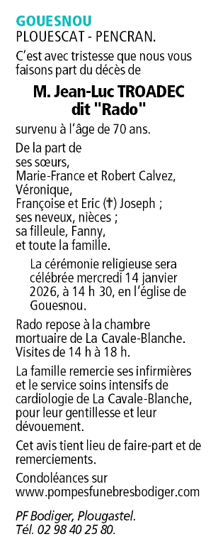 Décédé à Brest (29200, France) le jeudi 8 janvier 2026 à l'âge de 70 ans