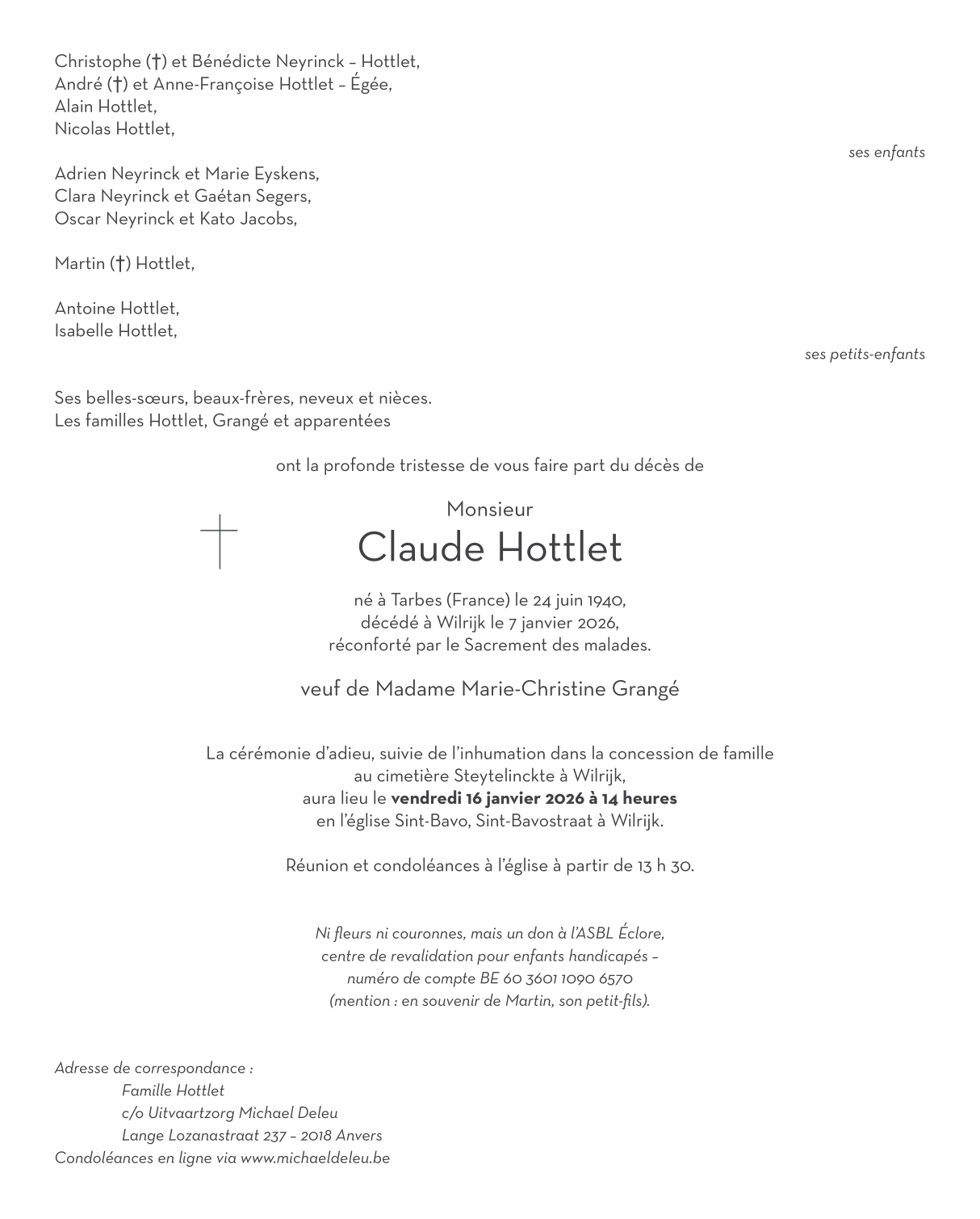 Fallecido en Wilrijk (Antwerpen) (2610) el miércoles, 7 de enero de 2026 a la edad de 85 años