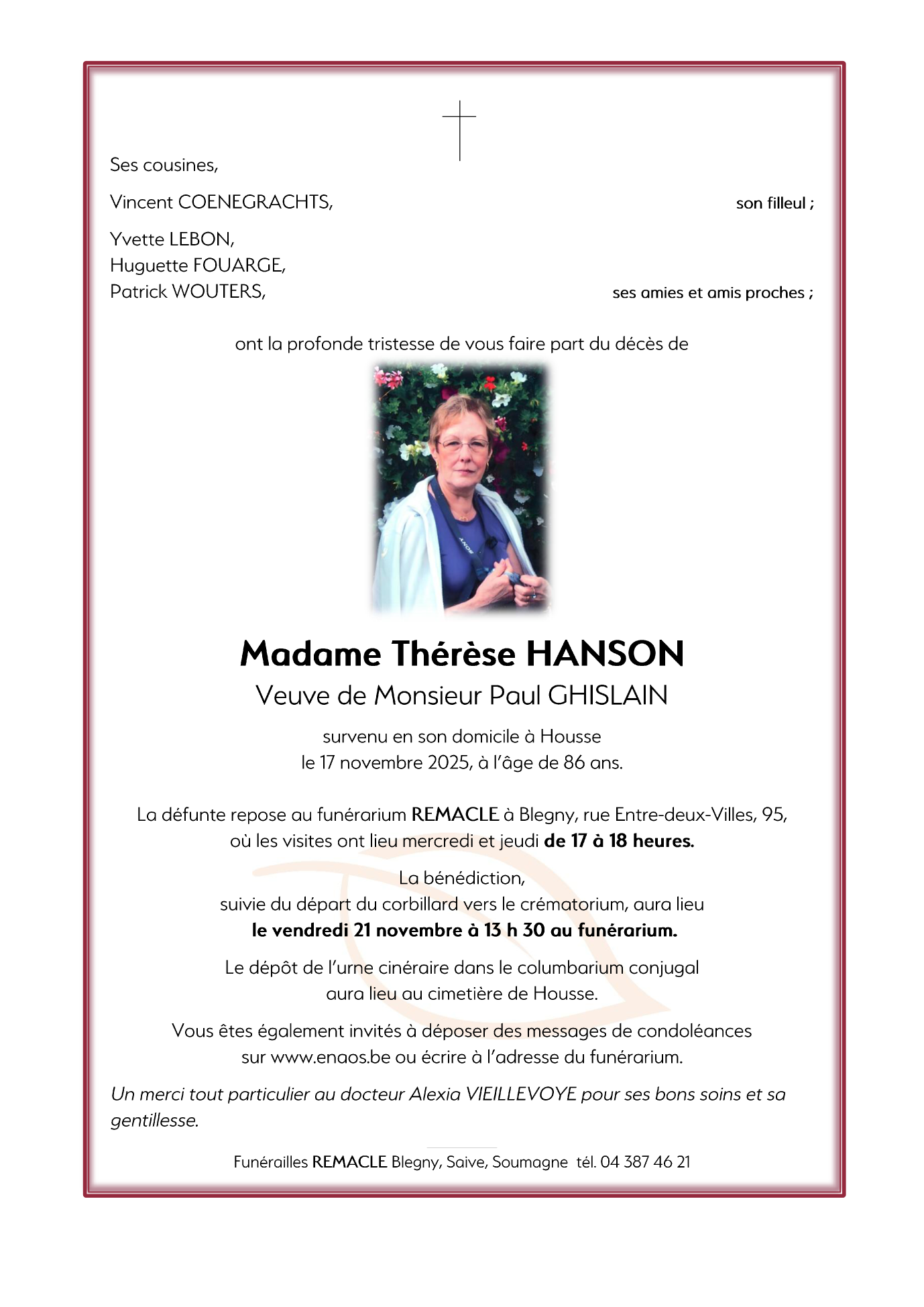 Décédée à Housse (4671) le lundi 17 novembre 2025 à l'âge de 86 ans