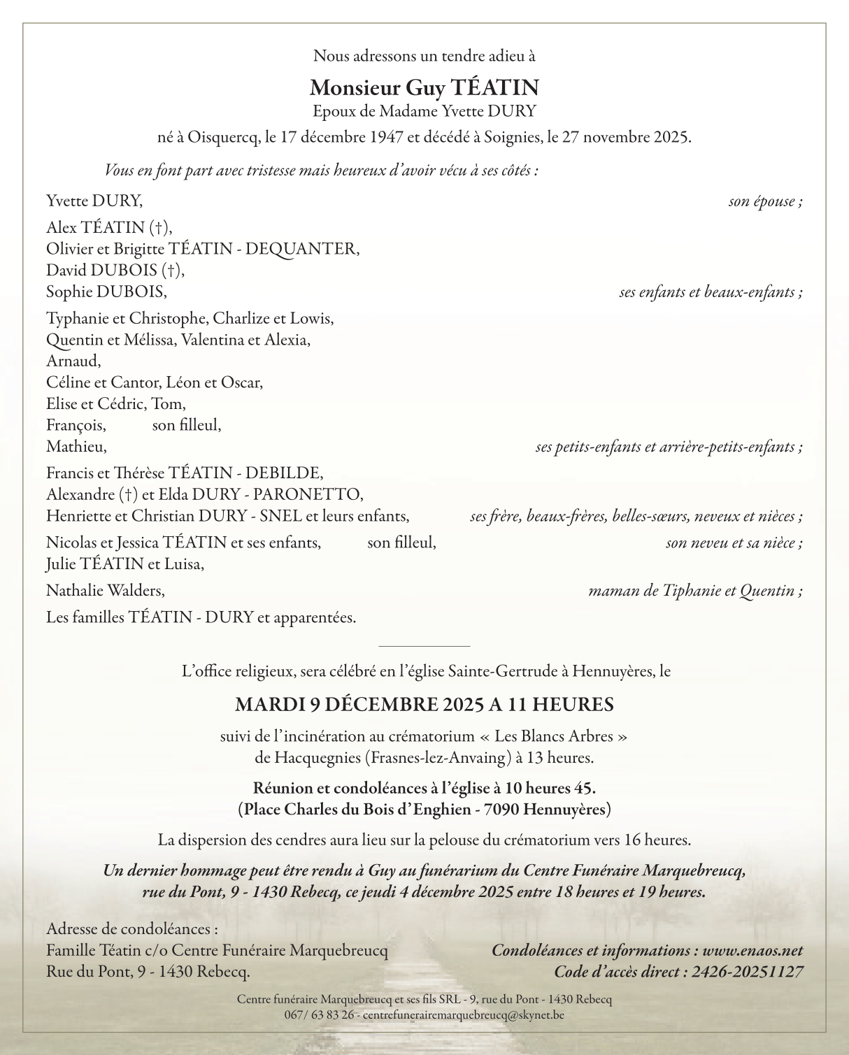 Décédé à Soignies (7060) le jeudi 27 novembre 2025 à l'âge de 77 ans