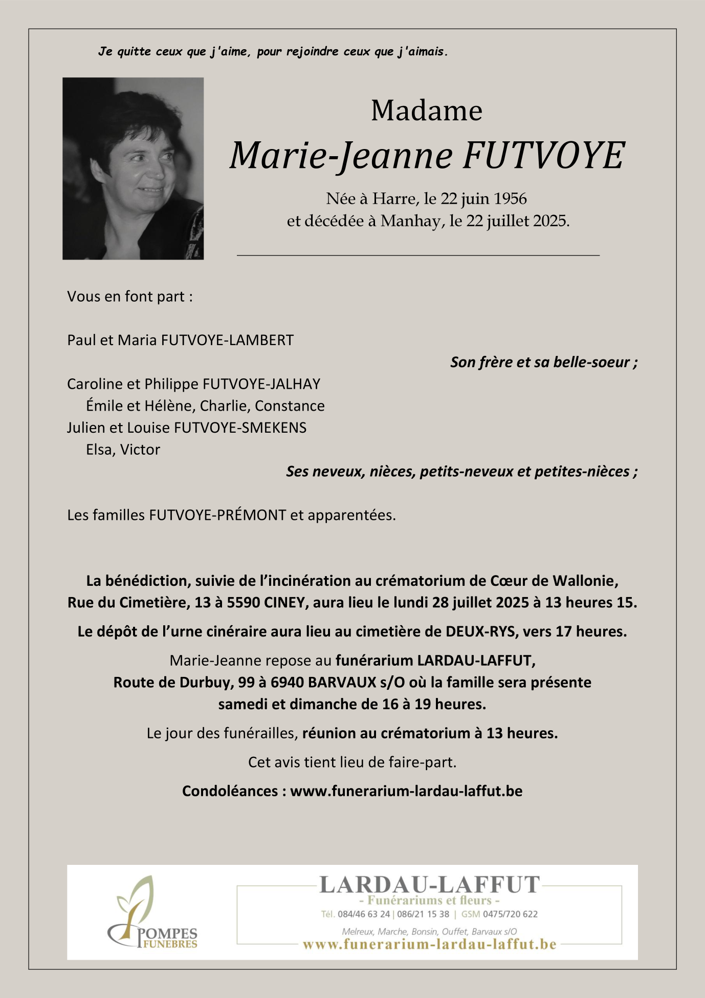 Décédée à Manhay (6960) le mardi 22 juillet 2025 à l'âge de 69 ans
