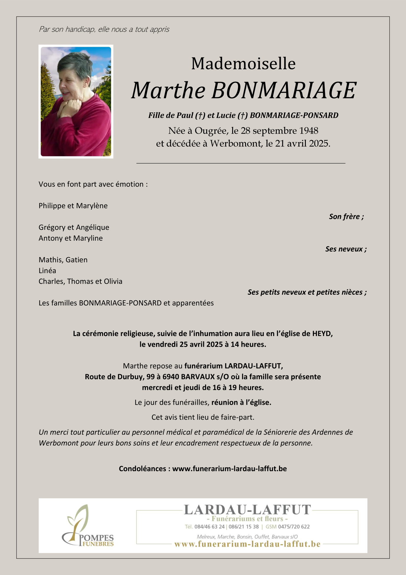 Décédée à Werbomont (4190) le lundi 21 avril 2025 à l'âge de 76 ans