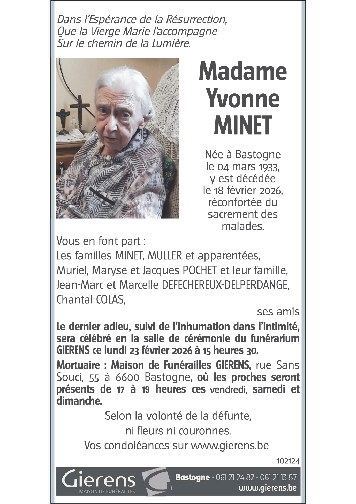 Décédée à Bastogne (6600) le mercredi 18 février 2026 à l'âge de 92 ans