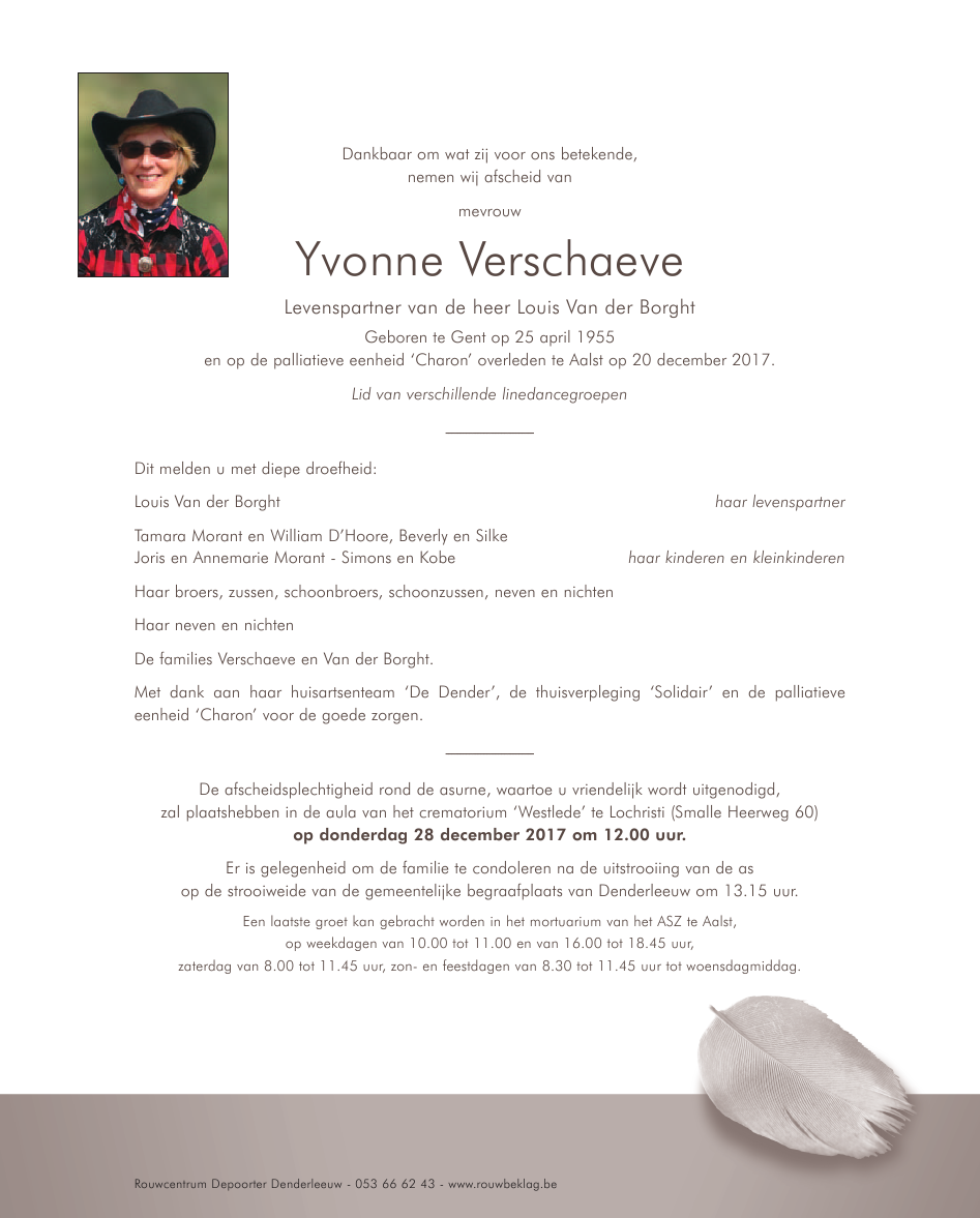Décédée à Aalst (9300) le mercredi 20 décembre 2017 à l'âge de 62 ans