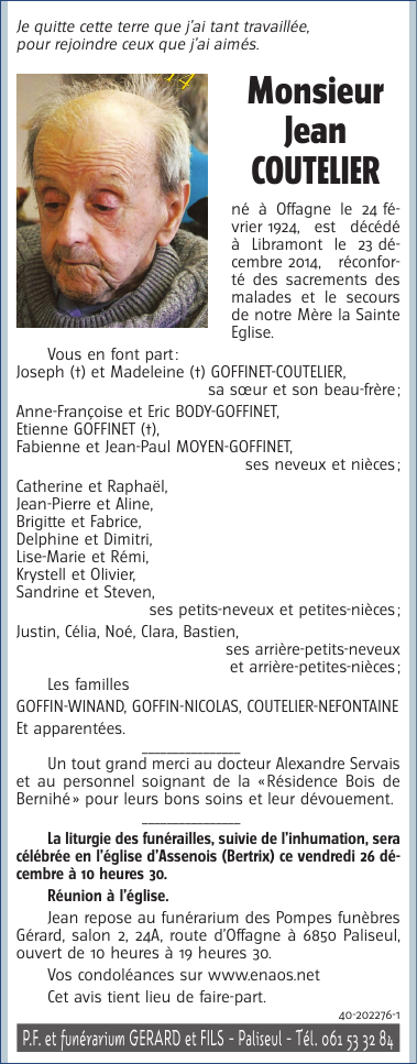 Fallecido en Libramont (6800) el martes, 23 de diciembre de 2014 a la edad de 90 años