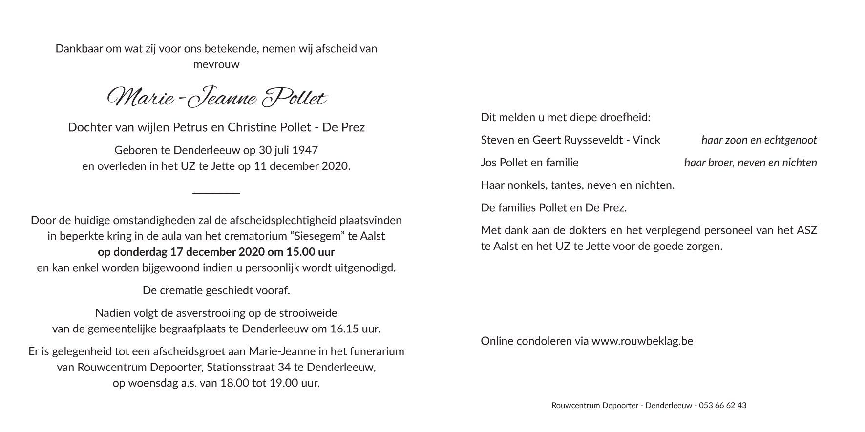 Died in Brussel (Jette) (1090) on 11 December 2020 at the age of 73 years