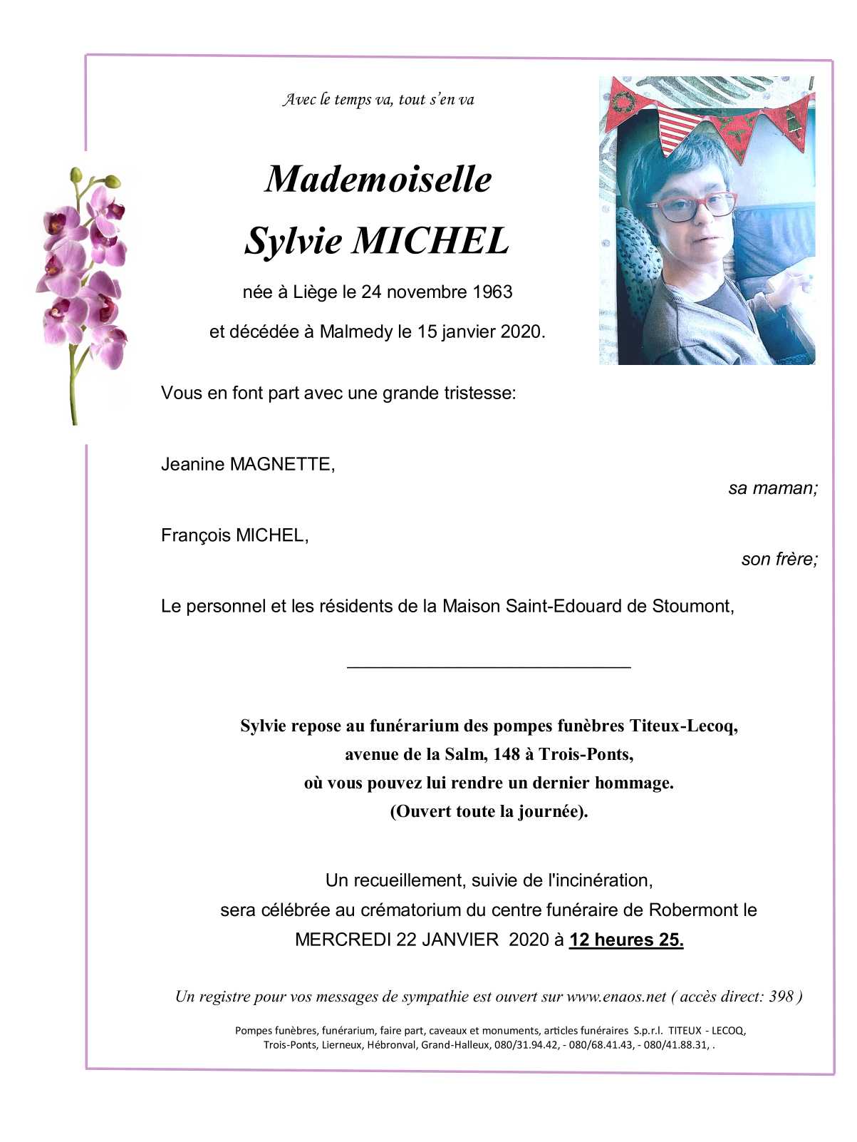 Fallecida en Malmedy (4960) el miércoles, 15 de enero de 2020 a la edad de 56 años