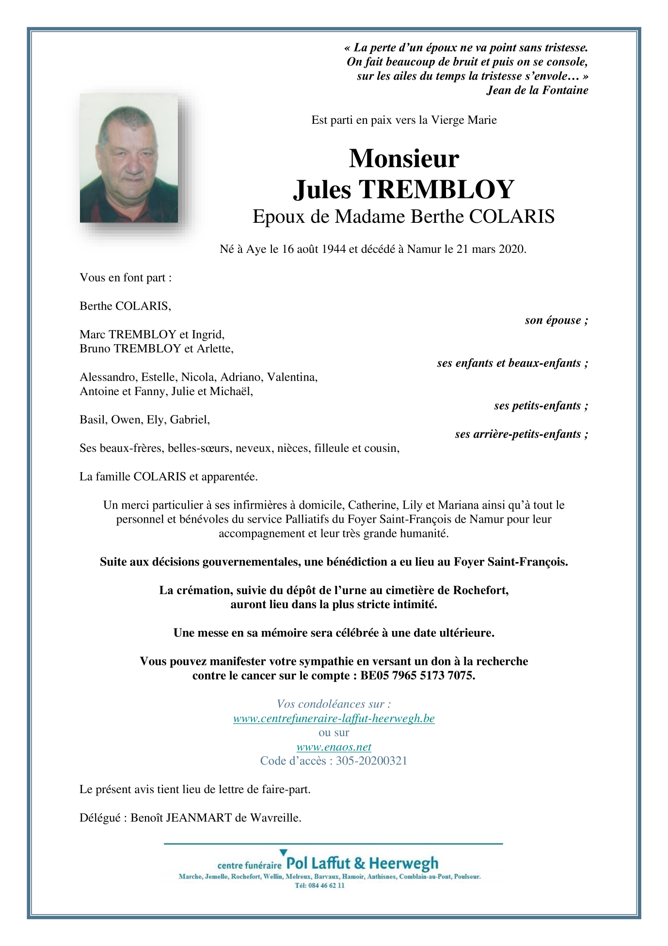 Fallecido en Namur (5000) el sábado, 21 de marzo de 2020 a la edad de 75 años