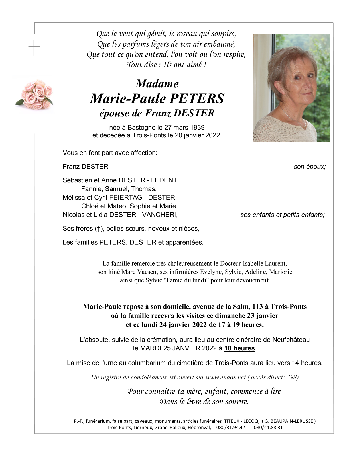 Décédée à Trois-Ponts (4980) le jeudi 20 janvier 2022 à l'âge de 82 ans