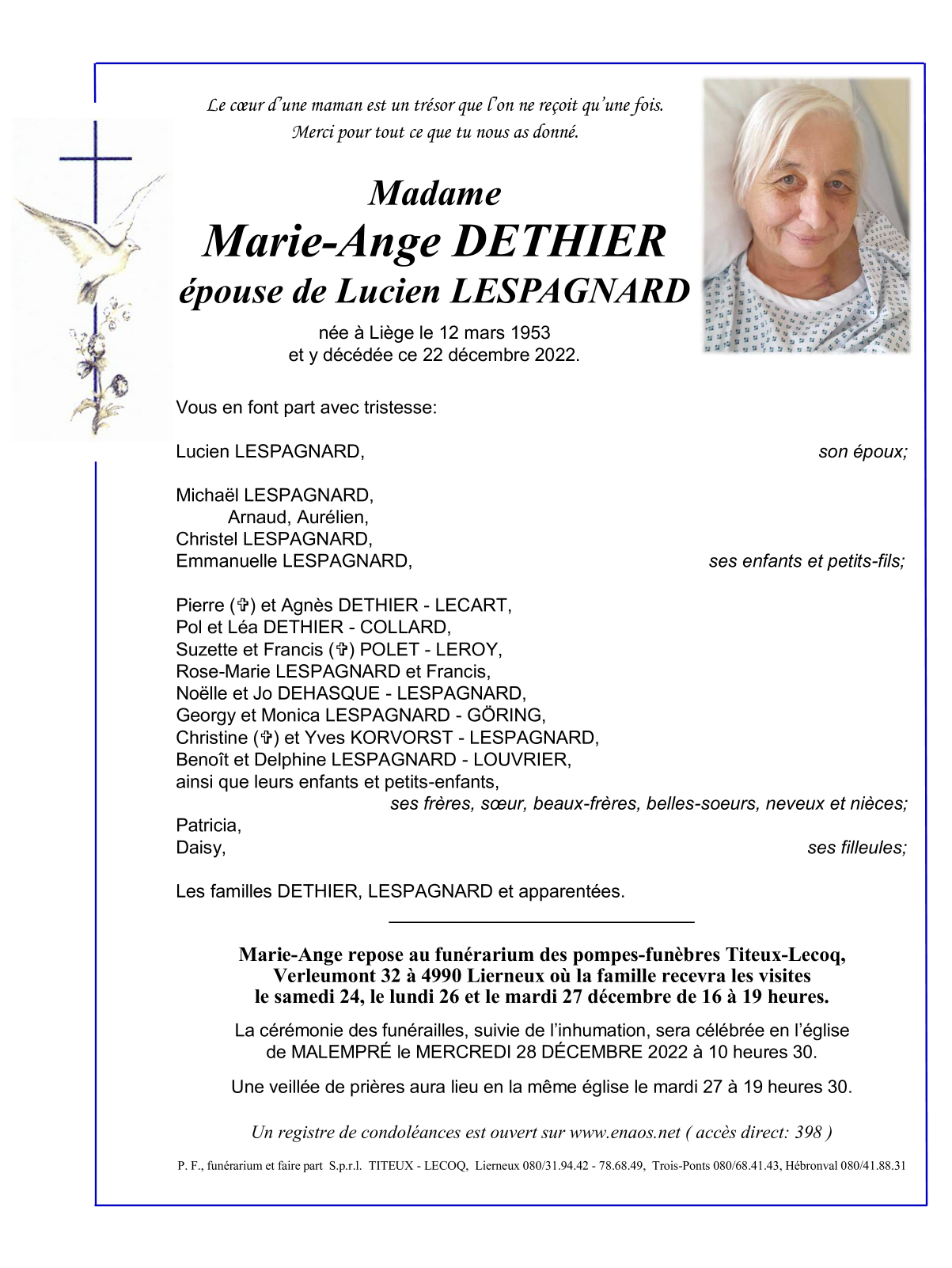 Décédée à Liège (4000) le jeudi 22 décembre 2022 à l'âge de 69 ans