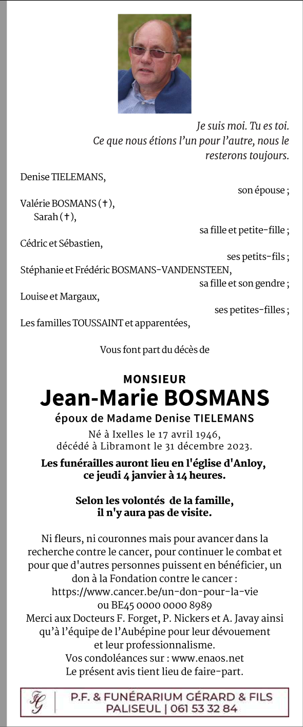 Fallecido en Libramont (6800) el domingo, 31 de diciembre de 2023 a la edad de 77 años