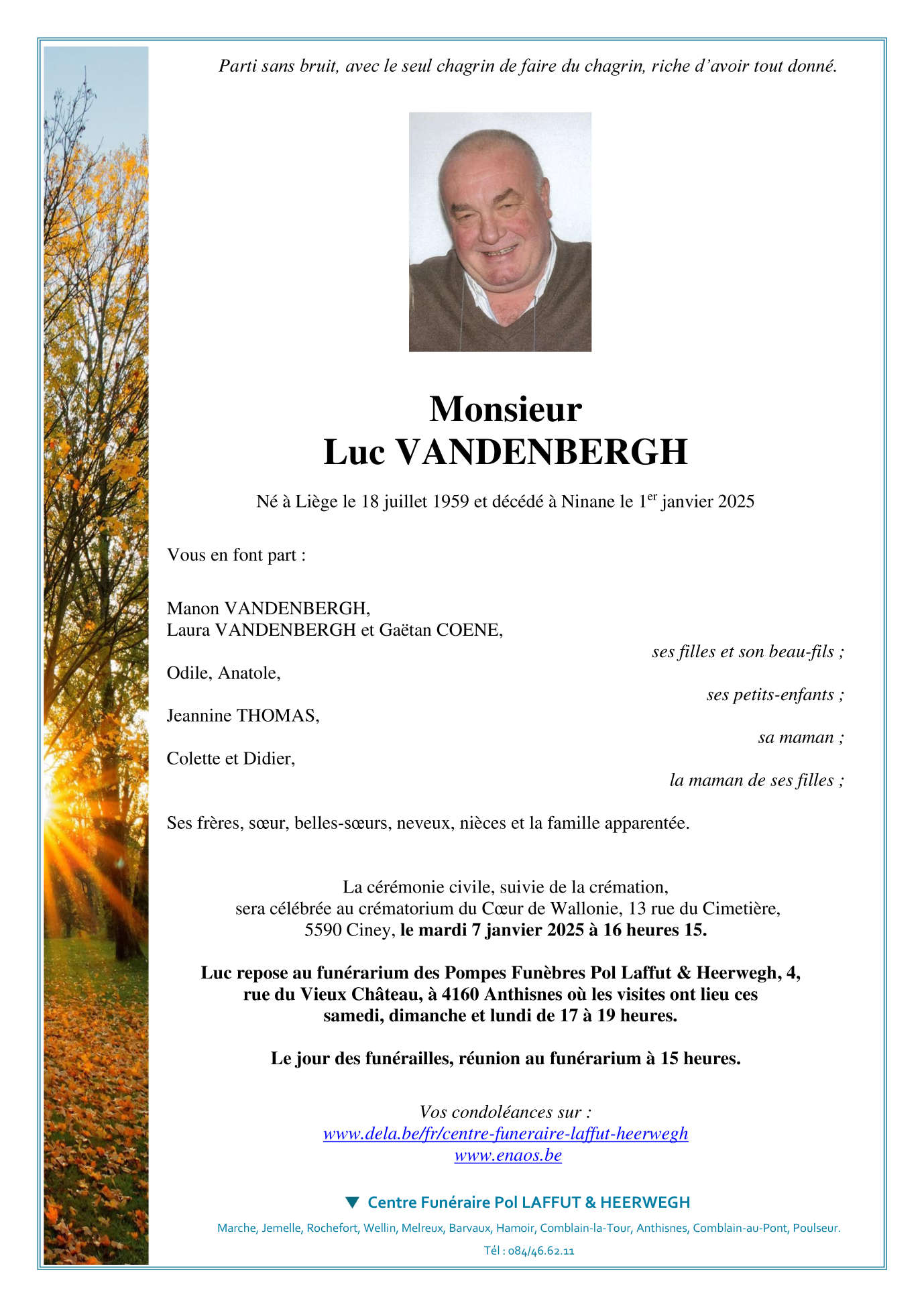 Décédé à Durbuy (6940) le mercredi 1 janvier 2025 à l'âge de 65 ans