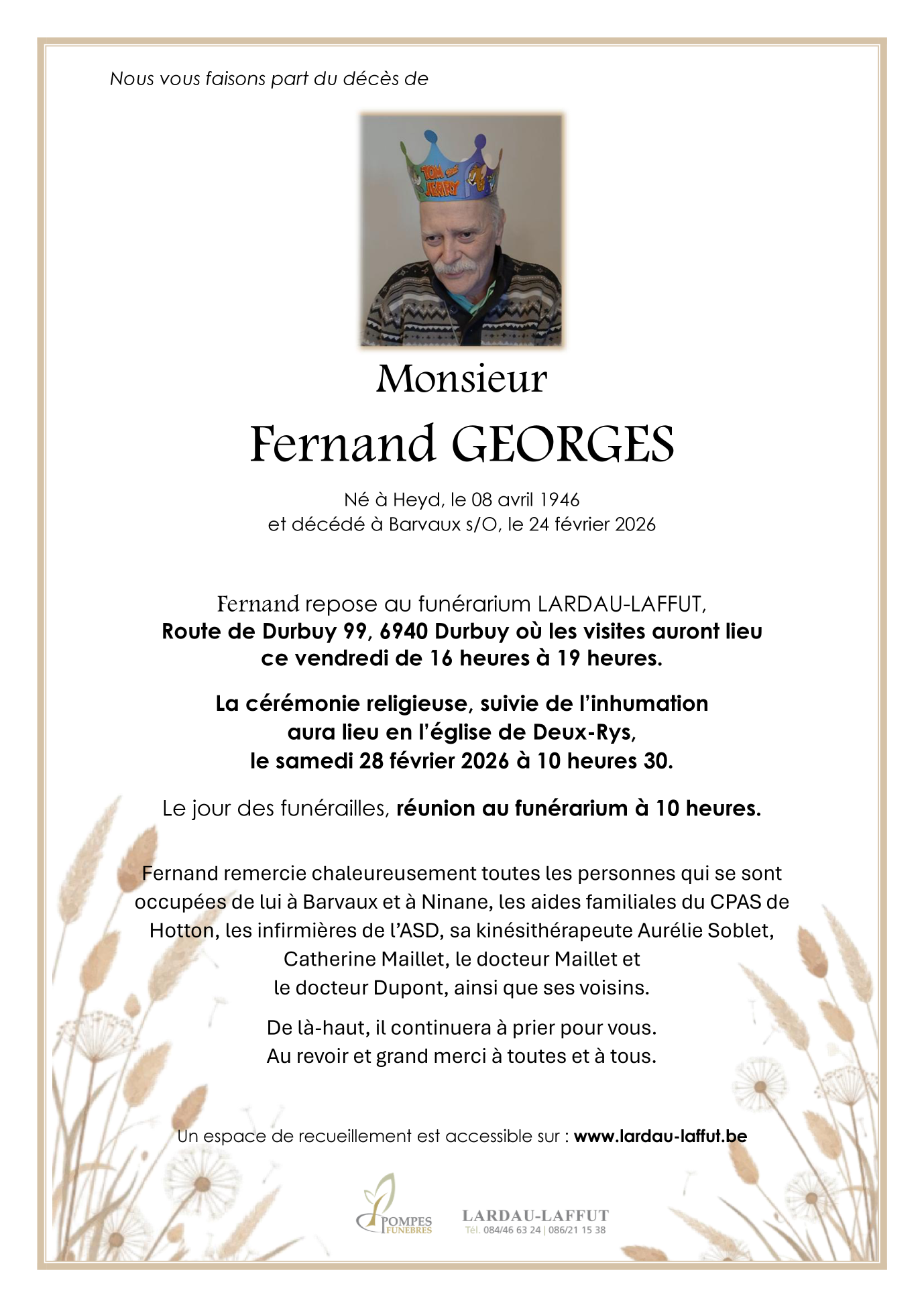 Died in Barvaux-sur-Ourthe (6940) on 24 February 2026 at the age of 79 years