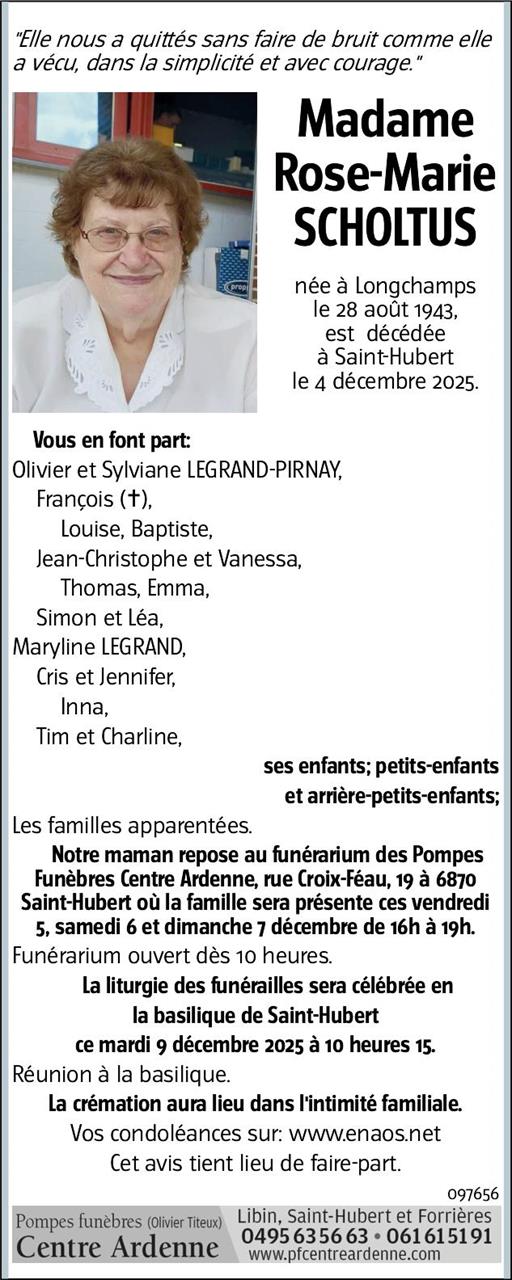 Décédée à Saint-Hubert (6870) le jeudi 4 décembre 2025 à l'âge de 82 ans