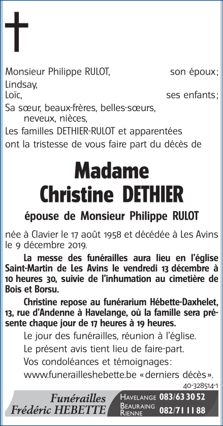 Décédée à Les Avins (4560) le lundi 9 décembre 2019 à l'âge de 61 ans