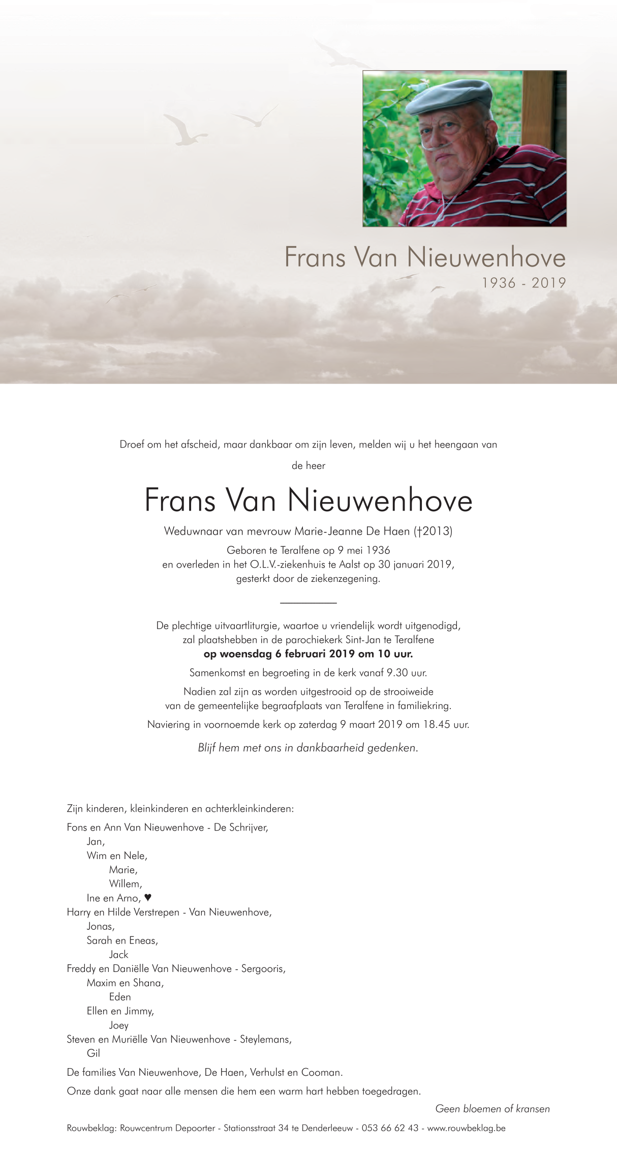 Décédé à Aalst (9300) le mercredi 30 janvier 2019 à l'âge de 82 ans
