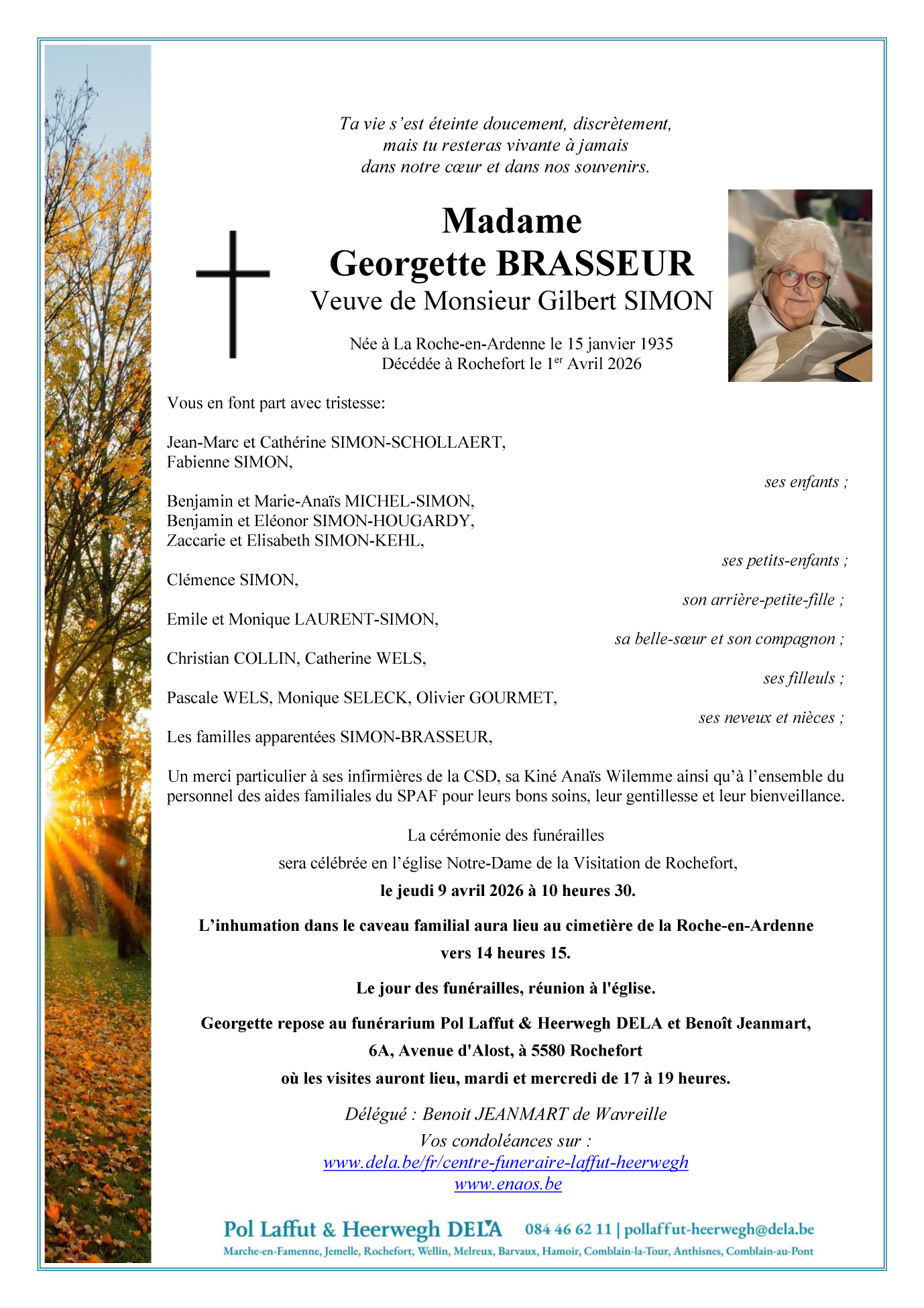 Décédée à Rochefort (5580) le mercredi 1 avril 2026 à l'âge de 91 ans
