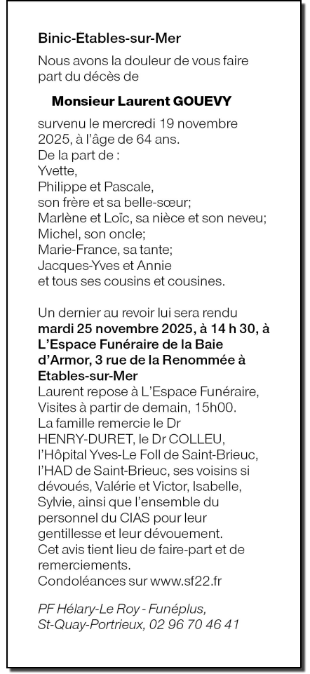 Fallecido en Saint-Brieuc (22000, Francia) el miércoles, 19 de noviembre de 2025 a la edad de 64 años