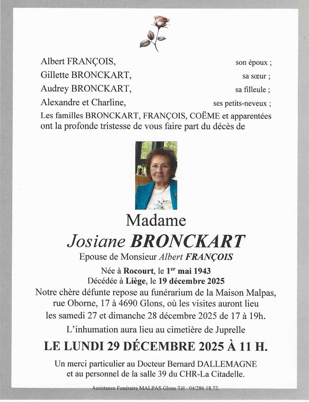 Décédée à Liège (4000) le vendredi 19 décembre 2025 à l'âge de 82 ans