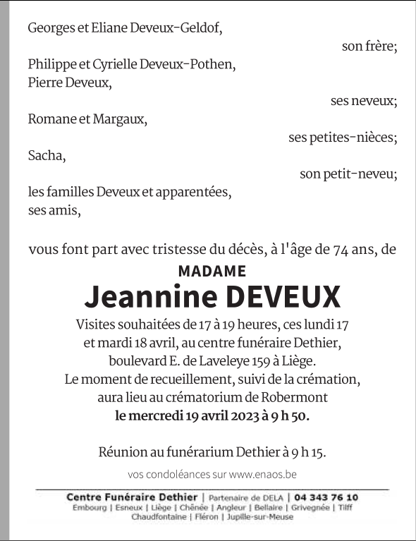 Fallecida en Liège (4020) el miércoles, 12 de abril de 2023 a la edad de 74 años