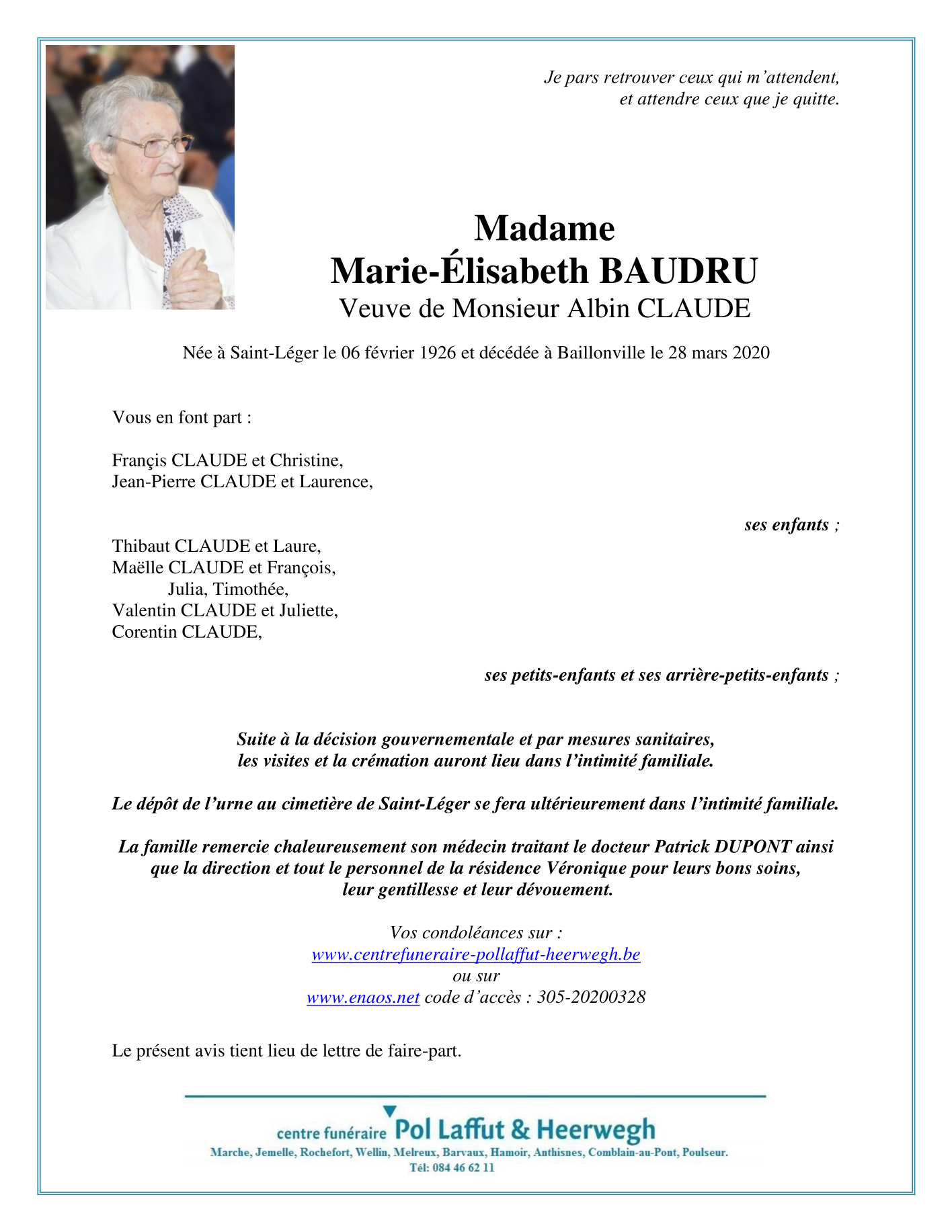 Fallecida en Baillonville (5377) el sábado, 28 de marzo de 2020 a la edad de 94 años