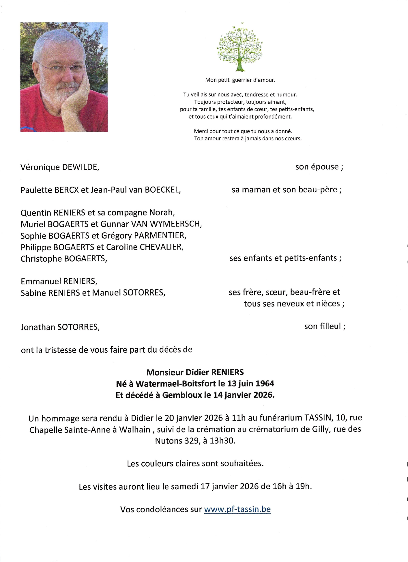 Died in Gembloux (5030) on 14 January 2026 at the age of 61 years