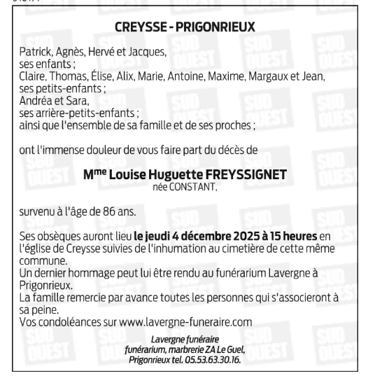 Décédée à Lalinde (24150, France) le dimanche 30 novembre 2025 à l'âge de 86 ans