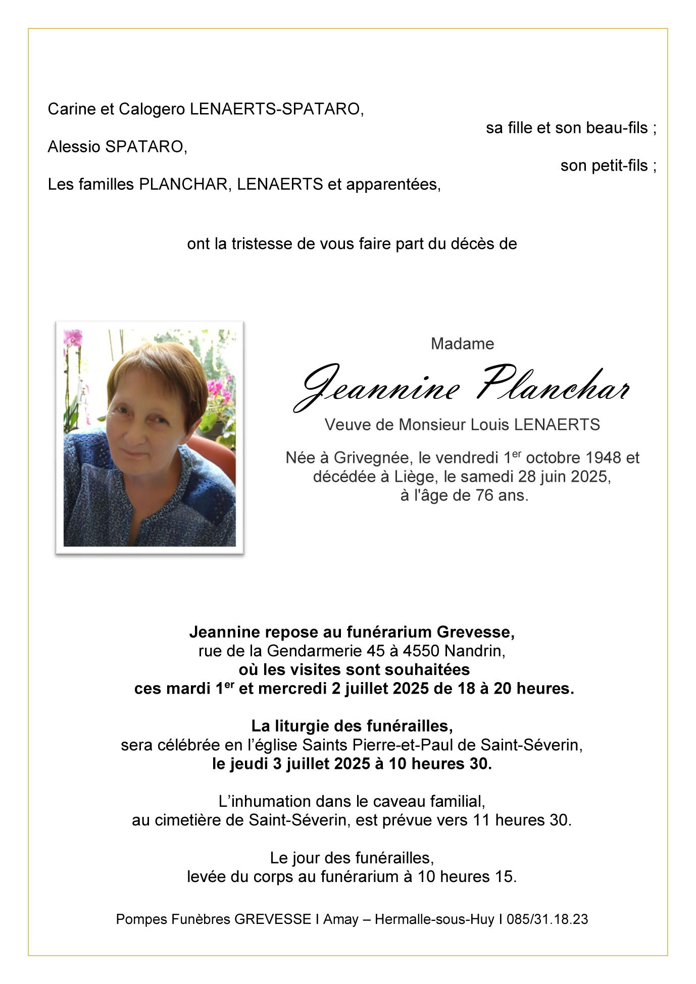 Décédée à Liège (4000) le samedi 28 juin 2025 à l'âge de 76 ans