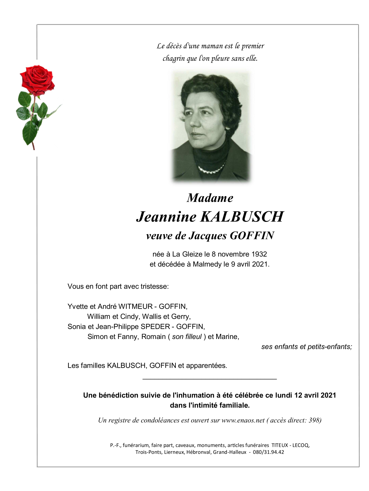Overleden te Malmedy (4960) op vrijdag 9 april 2021 op 88-jarige leeftijd